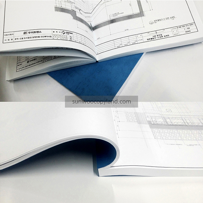 AB-0004 건축도면 / 반책 본문 [건축도면 / 반책 & 평철] 제 본 : 반책 제본(사진 위), 평철 제본(사진 아래) 표지용지 : 레자크 청색 내지용지 : 백상지 80g/㎡ 사 이 즈 : A4 (펼쳤을때 A3) 목록 이전글AB-0005 현황판 19.03.22 다음글AB-0003 준공도서 / 하드커버 19.03.18